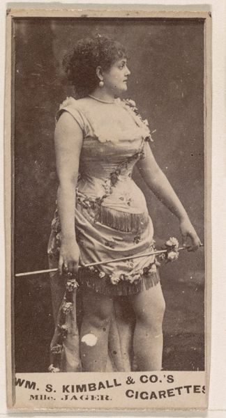 Editor: Here we have “Card Number 307, M. Jays, from the Actors and Actresses series,” an advertising card from the 1880s for Duke’s Cameo Cigarettes. The card is a photomontage depicting M. Jays, an actress, presumably. The aesthetic seems to recall the objectification of women that was a popular tactic in advertising during the time. What should we make of this piece today? Curator: Exactly! These cards were part of a larger system of commercial image-making deeply embedded in Victorian social structures. M. Jays, while presented as an individual, is also a commodity. Consider the power dynamics: who is consuming this image and why? What norms about femininity and desire are being reinforced here to sell cigarettes? Editor: So it’s more than just an advertisement; it’s also a reflection of the social climate? Curator: Precisely. Think about the construction of celebrity, the male gaze, and the rise of consumer culture all intersecting. This image is both a product of its time and a perpetuator of certain social standards. The very act of distribution, tucked into cigarette packs, speaks to how pervasive these ideals became. What do you make of the florals in relation to M. Jays, then? Editor: Perhaps an allusion to nature as delicate or for decoration. Are these allusions purposeful? Curator: Whether intentional or not, the language of flowers, the performative element of attire...all contribute to understanding the cultural tapestry of that period. These cards weren't just promoting cigarettes; they were subtly shaping desires and normalizing ways of seeing. Editor: I never considered that advertising could be such a powerful social force back then. Now I’m left questioning all the layers beneath such a seemingly simple portrait. Curator: And that is precisely where the richness lies: questioning. Analyzing visual culture provides profound insights into our past and, more importantly, its echoes in our present.