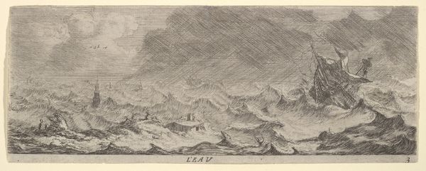 Curator: This etching by Stefano della Bella, titled 'Water, a ship at sea during a storm, from "The four elements,"' dates back to the mid-17th century. Editor: Wow, the sheer dynamism of that tempest grabs you right away. It’s all swirling lines, chaos rendered in miniature. Curator: Precisely! Consider the symbolic weight. Water, often a sign of cleansing and rebirth, here becomes a force of untamed power, almost biblical in its intensity. The ship, a representation of humanity, is tossed about, seemingly at the mercy of fate. Editor: It's fascinating how the material of printmaking itself plays into this. Etching, with its ability to create such fine, dense lines, allows for an incredible simulation of texture – the rough waves, the torrential rain. How long would such a detailed etching have taken to produce? And what were the economics of distributing prints like these? Curator: The act of facing an all-powerful and ultimately indifferent Nature becomes a meditation on humanity's place in the cosmos, one frequently revisited throughout baroque art and beyond. Editor: Absolutely, and I wonder how audiences at the time perceived it. Were they seeing a reflection of their own precariousness, or something more akin to disaster tourism, a thrill derived from a safe distance? The labour that went into such prints provided images that were much more portable than a massive canvas; and perhaps more available to those outside the upper classes. Curator: Perhaps both. It mirrors anxieties about earthly instability as much as it speaks to humankind's spirit. Notice how despite the peril, the ship persists, sails straining – a little symbol of defiance perhaps? The Baroque style certainly lends itself to dramatizing the fraught relationship between humans and the unknown. Editor: Ultimately, that ship—however romantic—depended on the hands that built it, on the resources it consumed. It forces one to ask questions about who would profit from this vessel when so many hands were contributing to its ultimate construction. Curator: Indeed, the narrative unfolds through layers of interpretation and speaks to an array of socio-cultural realities. The storm then takes on yet more symbolism, perhaps representative of change and uncertainty that swept the age. Editor: An intense and beautiful artifact, both as an aesthetic achievement and as a tangible representation of complex material histories.