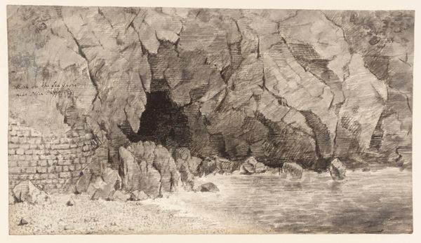Editor: This is Sir Edward Poynter’s pencil drawing, "Cliffs at Tintagel." It’s quite striking how the texture of the cliffs dominates the composition. What strikes you about this piece? Curator: I'm interested in the graphite itself. How does its application, the very labor involved, shape our understanding of the scene? Consider the geological processes made visible by the artist's hand. Editor: So, you're thinking about the connection between the artist's process and the geological processes they're depicting? Curator: Precisely. The drawing isn't just a representation; it’s a material record of observation and labor. It challenges any romantic notion of the landscape. Editor: That gives me a totally different perspective on how to appreciate it. Thanks! Curator: Indeed, it is through the means of production that we understand the essence of the artwork.