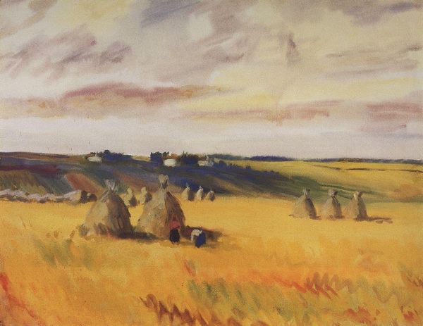 This is a landscape by Zinaida Serebriakova, made with delicate brushstrokes, probably in oil on canvas. The colours are muted; there's a real sense of hazy atmosphere. What grabs me is the tension between the flat, almost abstract planes of colour, and the realistic details, like the haystacks dotted around the field. Look at the way the light hits the large golden field in the foreground; it's painted with such a gentle touch, but it creates a strong sense of depth. The eye is drawn back and back into the image. There is a little track marked by darker paint that meanders through the scene, almost like a drawing on top of a painting. Serebriakova has such a distinctive vision. You might see echoes of Impressionism here, but for me this has something of the graphic sensibility of someone like Vuillard. It's an image that invites you to slow down, to wander through it, and to find your own way.