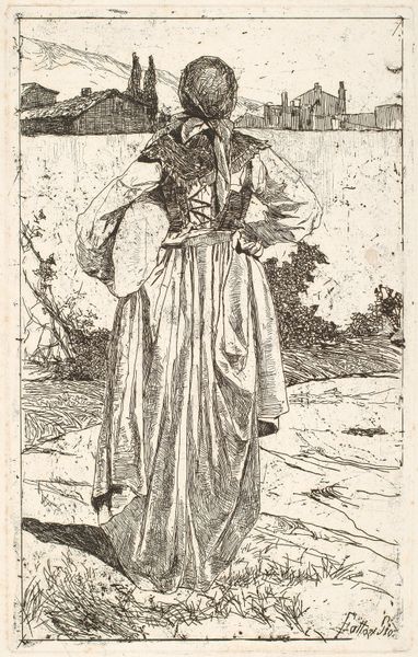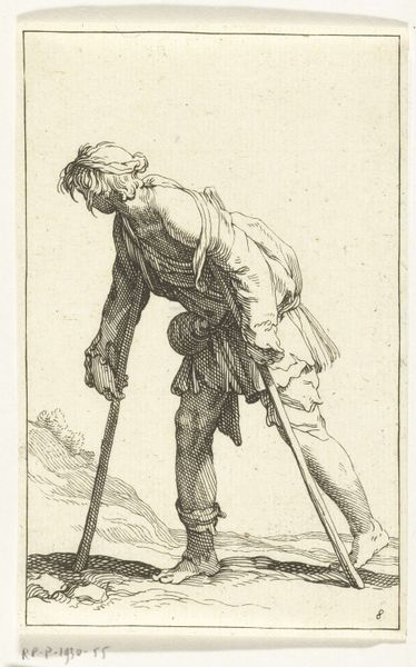 Editor: Here we have "A Woman Carrying a Basket" by Cornelis Bega. It's a small, detailed print that looks like it captures a candid moment. It's almost gritty with those stark lines and tones. What do you notice when you look at it? Curator: Well, it certainly isn't just a woman with a basket, is it? It's about the weight of labor, the resilience etched into her posture. Bega, bless his soul, died so young, yet he captured something timeless here. Do you sense that too? Editor: Definitely. There’s a realness to her that transcends the centuries. It's more than just a genre scene. Curator: Exactly! It's a whisper of the everyday, elevated. A glimpse into a life, carrying more than just what's in that basket, wouldn't you say? It's heavy, thought-provoking work. Editor: Absolutely. I'll never look at a simple street scene the same way.