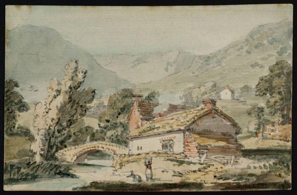 Curator: This is William Fleetwood Varley's watercolour, "Composition: Mountain Landscape." Editor: It feels so tranquil; the light is delicately balanced across the scene creating a subtle sense of depth. Curator: Yes, observe how Varley employs a structured arrangement of elements. The mountains, the buildings, the bridge—each form contributes to a balanced yet varied whole. Editor: The bridge seems particularly interesting; its presence signifies human intervention within nature, like a path, a connection, across this rugged terrain. A sort of visual metaphor perhaps. Curator: The horizontality certainly provides a point of stasis amidst the verticality of the landscape. Editor: Ultimately, the artwork evokes a serene, almost dreamlike quality, connecting us to the symbolic weight of nature's embrace, even as we make our mark upon it. Curator: Precisely, and in its restrained palette, we appreciate the formal composition; a landscape refined through the artist’s precise handling of form.