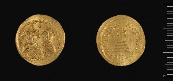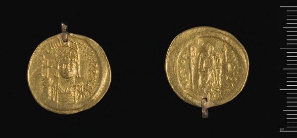 Curator: Here we have a gold coin, created by Abd-al-Malik of the Umayyad Dynasty, currently held in the Harvard Art Museums. Editor: It's remarkable how such a small object manages to evoke so much power and history. The gold practically glows. Curator: Indeed. One side features what appear to be two figures, likely rulers, their faces rendered in a stylized, almost Byzantine manner. The other presents a cross, a potent symbol adapted and recontextualized. Editor: The cross, of course, speaks volumes about cultural exchange and appropriation. The weight of that symbol, transformed within a new context, is fascinating. Curator: Exactly. And if we examine the incised details, we can decode the artistry involved in rendering form on such a diminutive scale. The composition also has a remarkable harmony and balance. Editor: It makes one think about the silent dialogue this coin initiated between empires. To look at it is to touch something very old, layered with narratives of conquest and belief. Curator: Precisely. It’s fascinating to consider how this coin's visual language blends different cultural motifs. Editor: Yes, a powerful intersection of faith and authority.