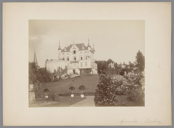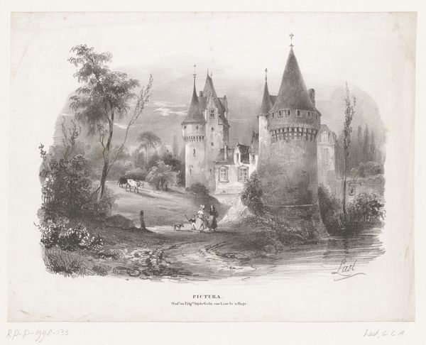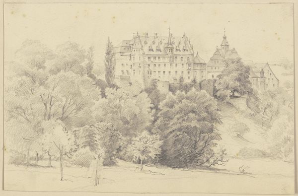 Curator: Here we have Auguste Boulard's "Château on a Rise," an etching dating to around 1877. Editor: It's moody, isn't it? That heavy sky... and the way the château is almost devoured by the foliage. It feels like a beautiful, gothic dream. Curator: Yes, there’s a strong sense of atmosphere created by the etching process. Notice the intricate cross-hatching, particularly in the sky and foliage, allowing Boulard to capture the textures and forms that communicate something quite striking to our senses. Also, it emphasizes that this château is both the subject, but it is consumed, essentially, by the medium's capability. Editor: I keep thinking about who lived there, what they ate, the kind of parties they threw… it’s just got that palpable, romantic atmosphere that suggests stories clinging to the walls. Or maybe that's just me projecting. I imagine it in different stages, like an actual photograph. Curator: I appreciate that perspective! From my view, I see Boulard’s technique. Etching offered the ability to reproduce images widely, connecting with the rise of industrialism and the democratization of art. This scene speaks to both the rising merchant classes seeking symbols of wealth and privilege while highlighting Boulard's masterful command of printmaking techniques and how it can emulate a high value symbol. Editor: True, but you know what? Seeing it through that lens somehow adds to the romanticism for me. Knowing it was meant for wider circulation, made for consumption… it amplifies the fantasy. It means more people dreamt the dream of that castle, right? And the artist gave everyone an entry into high status. Curator: I think we can both agree the artistry is undeniable. Editor: Absolutely. I mean, talk about capturing a place's soul. This little etching managed it. Curator: The merging of technological advances with the past has always held complexities that still linger today. A worthy reflection for modern life in general, wouldn’t you agree? Editor: Indeed. Art making imitates life. I can always reflect deeper than surface value through art making.