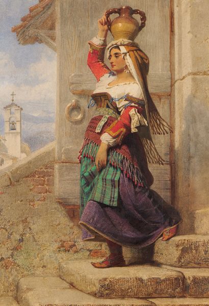 Editor: This is Frank Duveneck’s *Florentine Flower Girl*, circa 1886. It’s an oil painting. What strikes me first is the soft, almost hazy quality of the light and how it drapes around the figure. It’s beautifully composed, but what details are essential to unlocking its meaning? Curator: Indeed, the treatment of light is paramount. Consider the way Duveneck manipulates the materiality of oil paint. Observe the broad, confident brushstrokes – especially in the background – that give way to a more detailed rendering of the girl’s face and clothing. This interplay of the abstract and the representational is quite sophisticated. What do you make of the colour palette and the way Duveneck orchestrates these hues? Editor: The colours seem deliberately muted. The reddish-brown of the skirt really pops against the paler tones of her skin and blouse, drawing your eye immediately. Is the contrast significant in itself? Curator: Precisely. The orchestration of warm and cool tones creates visual interest. But also observe the tonality overall and consider what the artist aims to evoke. The interplay of contrasting tones builds volume, creates dimension and provides definition to the volumes depicted. Also, consider the formal function of the composition. The young girl’s positioning, the artist’s creation, as such, exists for itself and through itself. There are no clues of its connection to external factors. Is there an alternative perception you can propose? Editor: Well, her gaze does draw me in. Before you mentioned the color, I was immediately taken by her expression of expectation. But focusing on what we can know purely from the visual aspects makes me rethink it entirely. Thank you. Curator: An object can reflect reality or the artist’s consciousness. It's about perceiving that synthesis. Thank you for helping unpack those aspects together!