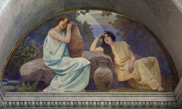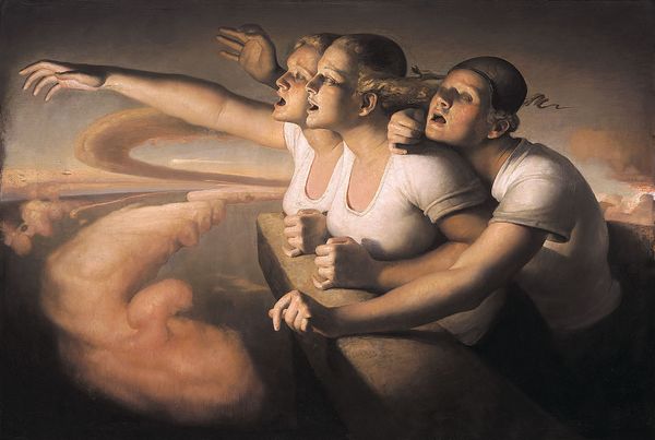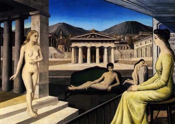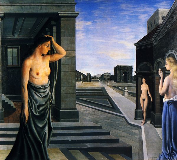 Editor: This is Julio Romero de Torres’s “La Buenaventura,” painted in 1922 with oil paint. What strikes me is how modern the women appear, almost transported from another era to this stark Spanish town square! What do you see in this piece? Curator: Ah, yes, “La Buenaventura”—The Fortune Teller. Romero de Torres, he’s a master of mystery, isn’t he? I see layers upon layers here. He’s like a stage director, placing these figures within a play, shrouded in Andalusian shadows, where sacred and profane waltz cheek to cheek. Tell me, what whispers to you from the seated woman on the left? The melancholic one, gazing down? Editor: There's a distinct stillness about her, a kind of world-weariness, or perhaps a resigned acceptance. It makes me wonder if she believes in what she’s hearing from the fortune teller. Curator: Exactly! And what a contrast with the woman on the right, who is engaged in telling destiny through cards, as some struggle with the cross in the background. See how the stark light illuminates her? The theatrics of it all! But think of the duality; hope and fate entwined with quiet desperation. This canvas isn't just pigment on cloth; it's a looking glass reflecting desires, fears, maybe even a secret or two. Don’t you agree? Editor: Absolutely, it's as though Romero de Torres captured a whole story in one frame, making the viewer an intimate spectator of this complex scene. It seems much more charged now that you point out the symbolism behind it all. Curator: Yes! Each element meticulously chosen, carefully rendered and rife with intent. Makes one consider fate versus agency doesn’t it? Makes me almost want to pull some tarot myself!