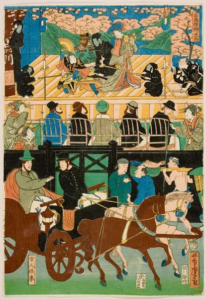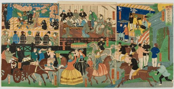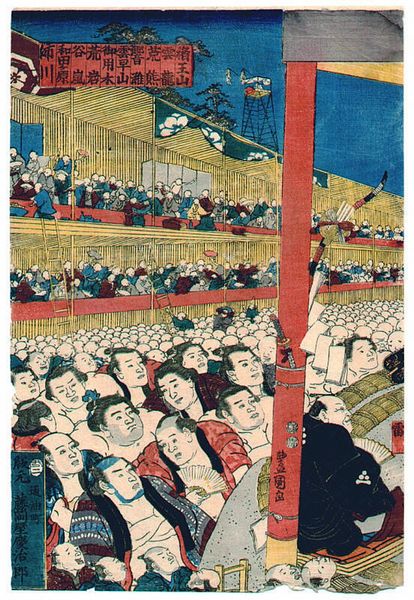 Editor: So, this is "Circus Scene with Changeable Central Acts" by Utagawa Masanobu. It's a woodblock print. I'm really struck by how the artist uses so much detail to show the excitement of the crowd. What do you see in this work? Curator: Note the composition. Masanobu employs a high vantage point and divides the space into distinct sections. The flattening of the picture plane and the repetition of figures emphasize pattern over realistic depth. Editor: That's true; it almost feels like a textile design with the way the crowd repeats. How does that contribute to the overall effect? Curator: Precisely. This flattening enhances the sense of spectacle, reducing individual identities to a unified experience. The formal elements become the story. It's less about individual emotion and more about collective visual engagement. Editor: That makes sense. I was so focused on the figures, I missed the overall visual impact. Curator: Indeed, a keen awareness of form enables a deeper understanding of its effect.