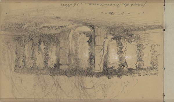 Curator: Here we have a drawing titled "Stenen Poort en Muur," which translates to "Stone Gate and Wall," attributed to Maria Vos and created sometime between 1834 and 1906. It is currently held here at the Rijksmuseum. Editor: It strikes me as very tentative, a collection of scribbled lines that barely manage to cohere into the shapes they are supposed to represent. There's an almost childlike simplicity to it. Curator: Indeed. It’s very much in the style of a preliminary sketch, possibly from a sketchbook. Notice the tonal variations achieved through light pencil and ink work, which suggests Vos was experimenting with depth and form, using line work predominantly to describe her subjects. The themes she was interested in are clearly evident here. Editor: To my eye, the stone gate suggests themes of access and obstruction, of division, really. Gates have been powerful symbols throughout human history and civilization. Here, though, the lack of finish detracts from the gate's more symbolic implications, it reads as form more than function. Curator: Perhaps the artist’s own position in society has shaped this imagery. Was Vos making a commentary? The institutional framework often relegated women artists to more domestic or amateur spheres, potentially influencing the subject matter and style, giving an insight in this work. Editor: That's an interesting idea, I do see echoes of art from amateur sketchbooks here, those places where a young, enthusiastic person attempts to imitate real master artists without understanding yet how their effects are achieved. The symbolism in the marks here is very different than in work produced from someone confident of a commission, or secure within the academy. Curator: Considering her status, the 'unfinished' aspect takes on a different significance. It speaks to the limitations placed on female artists, but simultaneously, this piece possesses an immediate, almost unfiltered perspective of observation of form and function, that is so very intimate. It transcends beyond constraints into an intriguing, possibly political perspective. Editor: Well, now I see more in it than a simple amateur rendering of an old wall. The artist has given us access to her method and through that her symbolic approach. Curator: Precisely, and this seemingly casual sketch opens a broader window into understanding 19th-century art production and society at large, reflecting how access and imagery played crucial roles. Editor: I am looking at the wall, really looking, not at Maria Vos. I hadn’t anticipated where we would go with this simple work.