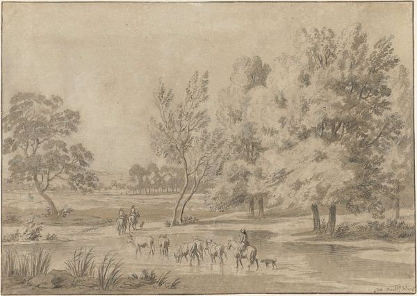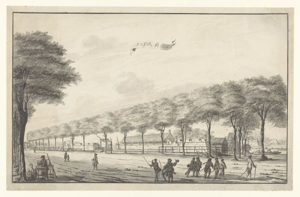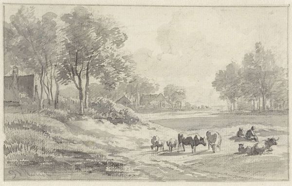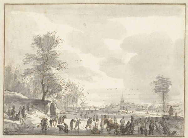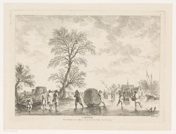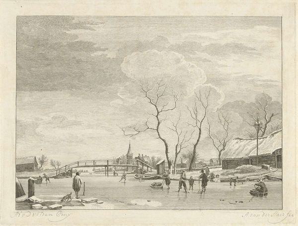 Curator: Welcome. We’re looking at Johannes Janson’s "Winter Landscape with Cows and Skaters," created around 1783. It’s an engraving, a print, residing here at the Rijksmuseum. Artist: It feels...sparse. Like winter stripped bare. I’m immediately drawn to the leafless trees; their skeletal branches scratching at that heavy, textured sky. Curator: Interesting choice of words! That starkness speaks directly to the realities of rural life in the Dutch Golden Age. Engravings like these were commodities, circulating images, shaping perceptions of landscape and leisure. The artist, Janson, tapped into a market that desired scenes reflecting daily existence. Artist: "Daily existence," yes, but heightened, romanticized. I can almost feel the brittle cold. The tiny figures skating—are they enjoying themselves or just trying to get somewhere? There's an underlying sense of both work and play. And the cows just casually plodding along - like time is immaterial to them! Curator: Those "casually plodding" cows are quite crucial to the material narrative! Dutch agriculture heavily relied on livestock. The presence of these cows underlines the economic foundation of the winter scene; livestock, transportation, leisure... it is all interrelated in this epoch. It's a study of human, animal, and land entanglement within 18th century Netherlands. Artist: Entanglement - I like that. It reminds me of how interconnected we still are, despite all our modern advancements. The clouds practically sit on the rooftops of that village, linking man and weather... that seems like a tangible reality to me, and speaks on the importance of landscape during the Golden Age. Curator: It speaks, arguably, to the modes of production in Dutch visual culture as well, the role of printed images in solidifying ideas of nation and landscape. We’re seeing the rise of the idea of leisure too - the everyday person as subject in art! Artist: Exactly. It gives this scene a relatable touch. A sort of human charm, a delicate touch. Almost feels like memory itself. That soft texture in the etching supports a melancholic aesthetic! Curator: Melancholic indeed, and very calculated, a part of visual strategies deployed during that period. Now, think about the socio-economic landscape and conditions behind Janson’s choices! Artist: That sort of thinking does tether you back to the tangible world! I am thankful for both sides of the conversation now. Curator: As am I, finding commonality in production and practice is my central aim!