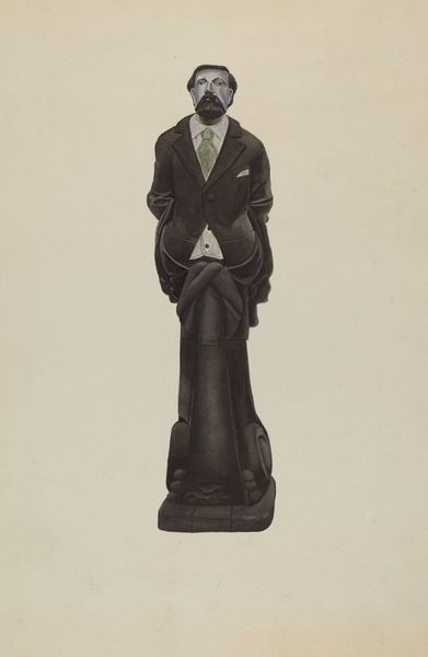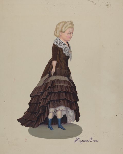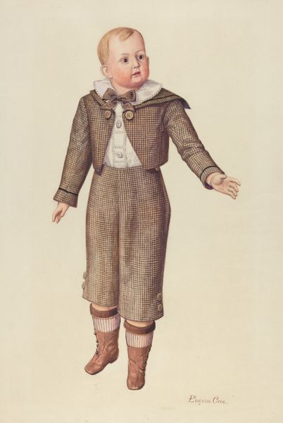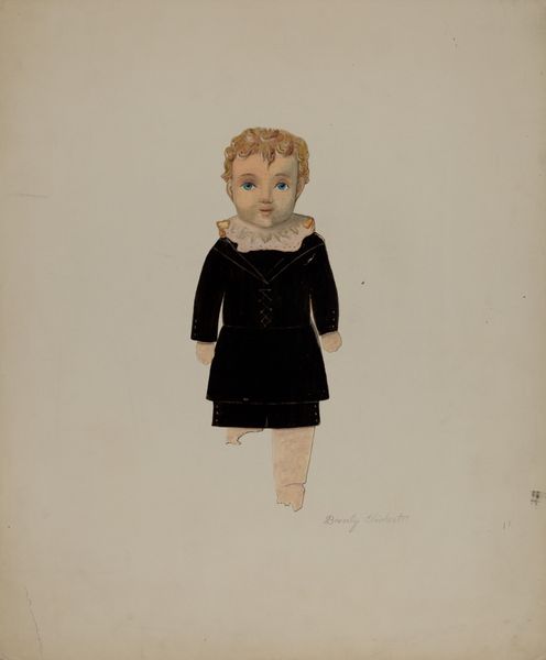 Curator: Today we're looking at Eugene Croe's "Boy Doll," a drawing from around 1937. Editor: My first impression? A little melancholic, wouldn’t you say? The figure, centrally positioned, is oddly formal for what I’d expect of a childhood portrait. Curator: It's the formal qualities that strike me, certainly. The composition, though simple, presents a rigorous exploration of line and form. Observe how the sharp edges of the clothing contrast with the smooth, rounded features of the doll's face. It creates an interesting visual tension. Editor: Interesting tension, yes, but it's unsettling. A boy, rendered as an inanimate object, reflecting the expectations of childhood during that era –the social constraints on boys' behaviour and appearance? It almost seems a critique of how society "dresses up" its children. Curator: Or simply capturing the style of dress typical for children during this historical period, evidenced by the tailored velvet suit, and the lacy collar – elements meticulously rendered. The textures, even in two dimensions, possess a tactile quality, demanding we acknowledge the materiality. Editor: True, but consider the racial implications. Why this particular model? The choice echoes broader societal power structures that normalize whiteness as the standard for beauty and innocence, further obscuring other voices. Who dictates which children become objects of aesthetic and social value? Curator: Your point is taken. But let us return to the pure formalism: the controlled palette; the subtle gradations of light. It's academic art at its most competent. The artist focuses our attention on geometric planes: consider the perfect rectangles of the stand versus the near circles implied at the sleeves. Editor: Those 'geometric planes' also flatten lived experience, reduce humanity to simple form. What gets lost when art only mirrors 'competence', as you say, and forgets to challenge our perspectives, our embedded prejudices? Curator: Perhaps Croe wanted viewers to fill the blanks with their perspectives, or he could simply intend to picture in two dimensions a cultural artifact from a given timeframe, focusing on details of dress. It gives the viewer space for reflection regardless. Editor: Indeed, food for thought about representation, intention and interpretation. Let's move on.
