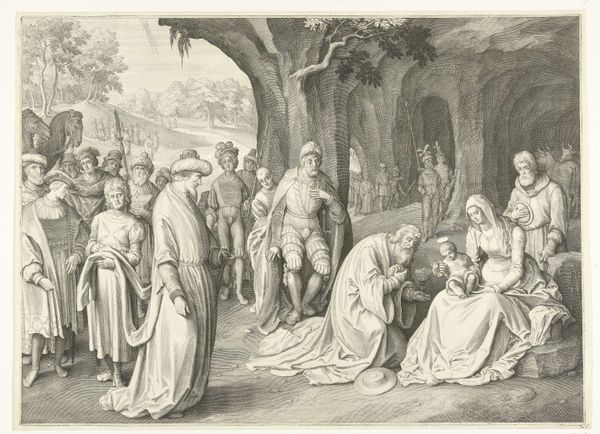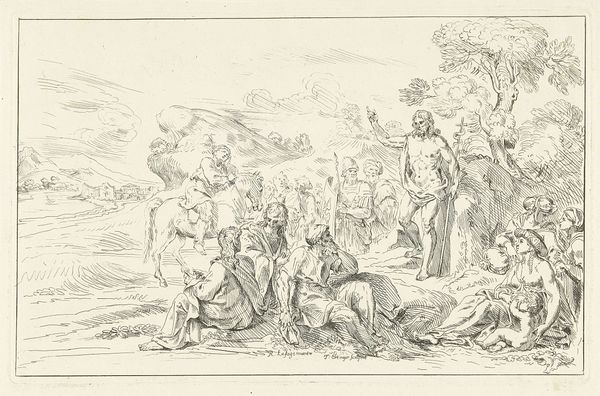 Editor: Right now, we're looking at "The Dutch Republic Receives the French Protestant Church," an ink drawing created sometime between 1695 and 1700 by Bernard Picart. The entire scene, rendered in ink, feels both classical and turbulent. There are figures being carried off a ship and supplicants on the shore. Further in, figures stand, sit and recline near some sort of regal figure with a book. What's your take? Curator: It strikes me as an incredibly empathetic snapshot of a significant historical moment. The way Picart uses line work to convey both the desperation of the refugees and the solemn welcome offered by the Dutch Republic… It's really moving, isn't it? Do you see how he contrasts the frantic gestures of those arriving with the composed postures of the figures offering sanctuary? That juxtaposition is key. Editor: Definitely. The chaos on the left contrasting with, as you say, the solemn welcome on the right. Is this baroque style attempting to showcase that sort of movement? Curator: Precisely! Baroque art thrives on drama and contrast, but here it's not just for visual flair. It's amplifying the emotional weight of religious persecution and asylum. Imagine being among those fleeing, and then finding…this. It makes one wonder, doesn't it, about the countless stories embedded within the image, the weight of their journeys? Also, allegorically speaking...what do you make of the symbols? Editor: I am not sure. But it appears as though the artist had so much to say and tried to tell it with as much imagery as possible. The seated figure on the right, with a book and canine… Maybe justice and loyalty? But still the work creates a mood. All those people trying to escape on ships…that is striking. Curator: Right. That feeling… I can't help but wonder about its relevance today as people seek refuge across borders, seeking hope where they can find it. Gives you chills. What have we learned? Editor: I think that considering the historical context deepens the impact and adds layers of meaning to the image that would have otherwise been overlooked.