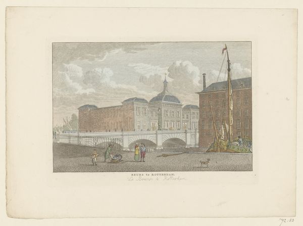 Editor: So, this is "Beurs te Rotterdam, ca. 1790," possibly created between 1786 and 1825, attributed to Carel Frederik (I) Bendorp. It's a watercolor and print piece depicting a cityscape. It’s rather…orderly, I think, with its defined architectural shapes. How do you interpret this work? Curator: I see this piece as more than just a depiction of a cityscape. Think about Rotterdam at that time - a booming port, a hub of international trade. The “Beurs,” or stock exchange, wasn't just a building; it was a symbol of capitalist expansion and the societal shifts that came with it. Who benefited from that boom? And whose labor built it? Editor: That's a really interesting point. I hadn't considered the socio-economic aspect of it. So, the artist’s choice to depict it so precisely, does that suggest a commentary? Curator: Precisely. Is the artist celebrating progress, or subtly critiquing the emerging class divisions inherent in this burgeoning economic system? Notice the ordinary people in the foreground going about their lives, while in the background the merchants would be accumulating wealth inside the Beurs. Do they even look like they’re part of the same society? Editor: I see that. The people in the front feel…almost separate from the impressive architecture behind them. It almost highlights that separation. Curator: And what about the Dutch Golden Age influences with the Baroque flair, doesn't that juxtapose nicely against what might now be called an early modern capitalistic venture? Editor: I didn't notice that the Baroque and Golden Age style was contrasting with it...That gives me something to explore, thank you. Curator: Absolutely, thinking critically about these layers gives us a richer understanding of both the artwork and the society it represents.