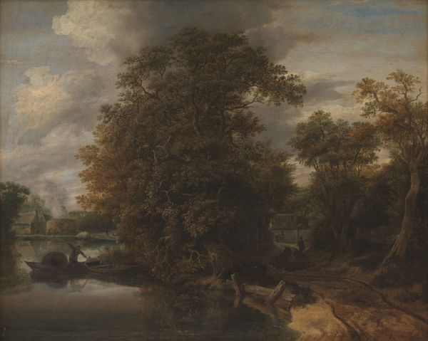 Editor: So, this is Patrick Nasmyth’s "Landscape with a Ruin." It's an oil painting, and it feels like a really romantic, almost melancholic scene. What do you see in this piece? Curator: I see a critique of power structures embedded within the landscape genre itself. The ruin, a symbol of decay, stands as a reminder of past empires and their impact on the land and its people. The darkness encroaching from the right could suggest an awareness of environmental exploitation, even in the early 19th century. What do you think? Editor: I hadn’t considered that. I was just seeing the beauty of the scene. Curator: Beauty is never neutral. Nasmyth, perhaps unconsciously, captures the anxieties of a changing world. Editor: That’s given me a lot to think about, thanks. Curator: Likewise. This painting speaks volumes about how we frame our relationship with history.