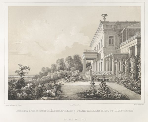 This print by J. Meyer depicts Le Palais de Znamensky near Peterhof, part of a series showcasing imperial palaces and gardens around St. Petersburg. Prints like these served a crucial function in the 19th century, offering visual access to elite spaces. Consider the power dynamics at play: the palace, a symbol of imperial authority, is carefully presented to a public audience, filtered through the artist's and publisher's perspectives. This image, created in an era of growing social inequality in Russia, subtly reinforces the Tsar's power by displaying the grandeur and order of his surroundings. The composition, with its emphasis on symmetry and manicured gardens, speaks to a desire for control and the imposition of order on the natural world, mirroring the social hierarchies of the time. To fully understand this work, we turn to historical archives, exploring estate records, travelogues, and social commentaries. By situating the artwork within its specific historical context, we recognize it as a cultural artifact, shaped by and reflective of the society that produced it.