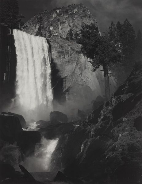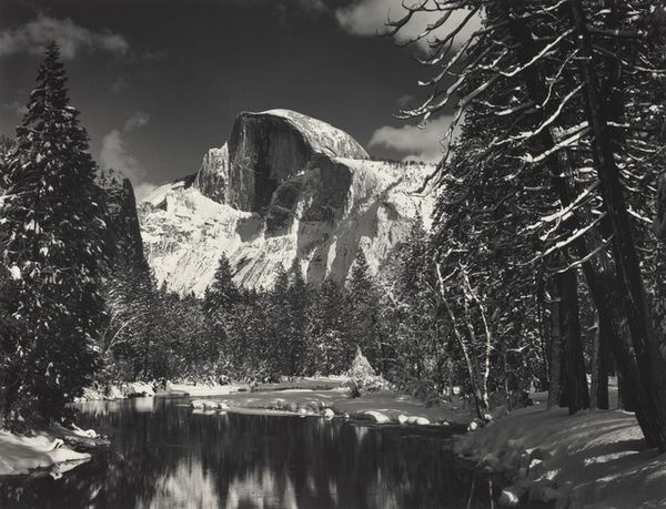 Editor: Here we have Carleton Watkins’s photograph, "Three Brothers," made sometime in the late 19th or early 20th century, using the albumen print process. The sepia tones give the landscape a dreamy, almost mythical quality. What’s most striking is the perfect reflection in the water – it doubles the grandeur! How do you interpret this work? Curator: The doubling is indeed key. It echoes a symbolic gesture toward reflection in the metaphysical sense. Watkins, and his contemporaries in the American West, like Ansel Adams, captured the sublime, but did they merely point their cameras, or were they conjuring something deeper? Notice how the composition leads the eye upward, then down into the mirroring depths. Editor: It’s like two worlds, one real and one…idealized? Curator: Perhaps. Or consider the “Three Brothers” of the title – what if these are not merely three rock formations, but an echo of figures from myth, legend, or even a familial archetype present in the collective unconscious? Photography at this time aspired to art – and art aimed at conveying an epic message. Look at the way the light drapes across the stone; how does that play into the overall feeling of permanence? Editor: It really does imbue the scene with a sense of timelessness. And the albumen print process – was that intentional, to further remove it from the present day? Curator: Exactly! Watkins uses that historical process to heighten this very sensation. Every photographic method carries its own historical weight. Editor: I see the picture with new eyes now – thinking about the cultural meaning embedded in its materials, its composition and even its title! Curator: The image functions as a mirror for us, asking how we interpret the enduring stories coded within it.