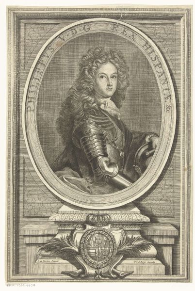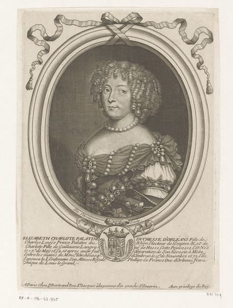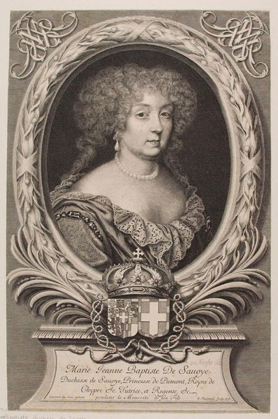 Editor: Right now, we're looking at an engraving of Marie-Jeanne-Baptiste, Duchesse de Savoie, made in 1678 by Robert Nanteuil. It's a fairly formal portrait, but her gaze is almost playful. What catches your eye when you look at this piece? Curator: Playful indeed! I see a woman confidently owning her space. Beyond the exquisite detail of the lace and pearls – details just begging to be admired – it's the frame itself that whispers volumes. See how the foliage feels both celebratory and a little untamed? To me, that frame, and perhaps her expression too, suggests a spirit chafing against the confines of courtly expectation. Do you get that sense as well, or am I just projecting my own rebellious heart onto a 17th-century duchess? Editor: No, I see that too! Especially juxtaposed with all those symbols of power at the bottom – the crown, the crest, the inscription... It's like two competing forces, pulling in different directions. It feels modern, in a way. Curator: Exactly! Nanteuil was a master of capturing not just likeness, but *presence*. I wonder, what stories did those eyes witness? This portrait isn’t just ink on paper; it's a portal. Next time you're feeling a bit rebellious, channel Marie-Jeanne! Editor: Definitely! I never thought I’d find a kindred spirit in a Baroque portrait. I’m now keen to see more engravings. Thanks for sharing your view! Curator: My pleasure! Now go forth, young Padawan, and discover your own portals within the art world!