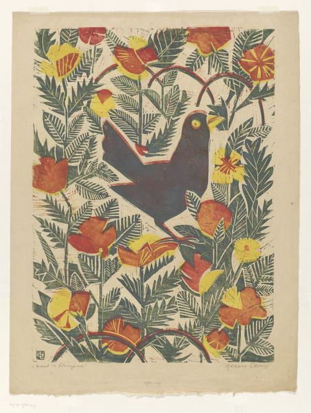 Hiroyuki Tajima made this print titled 'Fallen Leaves A', using woodblock printing, a technique deeply rooted in Japanese artistic tradition. Tajima came of age during a period of rapid social and political change in Japan, with the rise of nationalism and militarism casting a long shadow over artistic expression. The print presents a stylized bird amidst fallen leaves and blossoms, rendered in warm tones against a dark background. There is a sense of quiet contemplation and perhaps even a touch of melancholy, hinting at the artist’s emotional response to the world around him. While seemingly simple, 'Fallen Leaves A' carries complex layers of meaning. Tajima's choice of subject matter and his engagement with traditional printmaking techniques can be seen as a way to explore themes of identity, history, and cultural memory. The work invites us to consider our own relationship to the natural world and the passage of time.