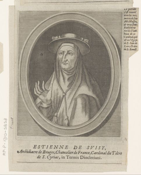 Editor: This portrait conveys such gravity, even melancholy. The fine lines and subtle shading communicate a somber mood. Curator: Precisely. What we see here is an engraving, a print dating back to 1660. The artist, Etienne Picart, captured the likeness of Bertrand Augier de la Tour. Notice the oval frame within the rectangular sheet—it structures the composition elegantly, doesn't it? Editor: It's an interesting choice of medium for someone of such high status, a cardinal. Was engraving a more accessible format for portraiture at the time? What about the work of his hands; the manual skill etched onto the plate is striking. Curator: The sharp, clean lines produced via the engraver’s burin contrast vividly with softer artistic mediums like painting. Look at the details etched into his garment—it indicates refinement, but the stark quality reminds us of mortality; of permanence and inevitable decay all at once. Editor: I find myself drawn to the lettering beneath the portrait; this inscription emphasizes his titles and hierarchy as “Archbishop” and “Cardinal”. Yet, isn't the whole engraving also highlighting a socio-economic hierarchy? Whose hands are truly represented? The person depicted? Or the skilled artisan reproducing the image? Curator: Interesting point. Beyond simple representation, the artistic hand and the subject converge into one significant figure, bound by material and social interactions; after all, one could not exist without the other. Picart's skill allowed Augier de la Tour to circulate his likeness widely—achieving, in a way, a form of visual immortality. Editor: An affordable likeness, but perhaps it also speaks to different audiences of wealth— commissioning and printing are two distinctly classed practices of art creation. This gives us more layers to think about in understanding class, and art in society. Curator: Indeed. This particular portrait prompts consideration not only about artistry, but it illuminates the nature of status, authority, and, perhaps inevitably, death, in the 17th Century. Editor: This piece reminds us that portraiture through print isn't simply about immortalizing an individual, it captures wider cultural forces as well.
