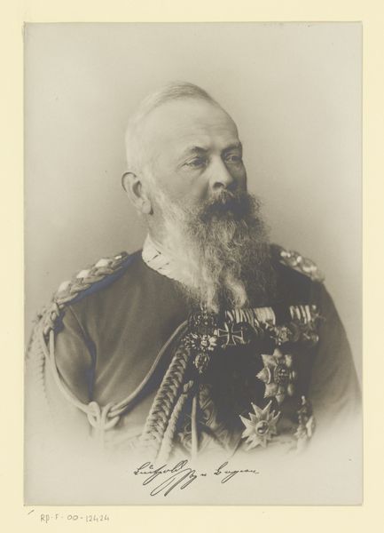 Editor: Here we have an undated photographic portrait of Leopold II of Belgium, likely before 1885. It's a very formal depiction, and the sepia tones give it a distant, almost haunting feel. What can you tell me about this piece? Curator: The weight of history certainly settles upon this image. To understand this portrait, we must confront Leopold II's brutal legacy in the Congo Free State. The crisp realism betrays the era's imperial ambitions, cloaking colonial exploitation beneath a veneer of progress. Notice the arrangement of medals, symbols of royal power—what narrative do these objects, staged so deliberately, obscure? Editor: So you're saying we can't separate the aesthetics from the historical context? That his actions in the Congo cast a shadow on how we view this image today? Curator: Precisely. Photography in this period functioned as a powerful tool of propaganda. It sold a romantic vision of colonial rule and national pride. It's critical that we interrogate this portrayal of power; who does it serve, and what violence does it conceal? Think about whose gaze is centered here. Editor: That makes me consider how the photographer, too, becomes implicated in this colonial narrative. Were they consciously complicit? Curator: That’s the crucial question. Can we ever truly separate art from its entanglement with power and politics? The photograph presents us with an idealized leader; however, historical analysis reveals the human rights abuses and environmental damage inflicted under his regime. Can the beautiful rendering overshadow the unacknowledged histories of trauma and the suffering he enacted? Editor: It's disturbing to think about how easily such images could have manipulated public perception then – and how easily similar images still can today. Curator: It is a potent reminder, yes. By critically engaging with the art of the past, we can better dissect the visual strategies used to perpetuate injustice. What this portrait truly offers us, perhaps unintentionally, is an opportunity for a continued and essential reckoning.
