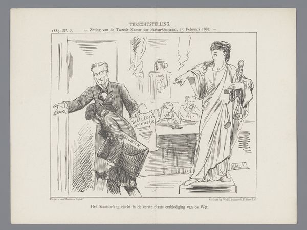 This print by Johan Michaël Schmidt Crans, made around 1867, captures the opening of the Dutch States-General. Two allegorical figures dominate the scene, one labeled "Colonial Matters" and the other "Financial Matters," each gesturing emphatically over a group of seated figures. The raised hand, a gesture we’ve seen echo through millennia, from Roman oratory to revolutionary rallies, here conveys a sense of urgent appeal, or perhaps even accusation. Note how the gesticulation and theatricality of the female figures contrast the passivity of the seated figures. Consider the emotional weight of these symbols. The artist taps into the collective anxieties of the time, using exaggerated gestures to evoke a visceral response. It is this powerful, subconscious engagement that ensures the image resonates, not just as a record of a political moment, but as a lasting expression of public sentiment, echoing through the corridors of history.