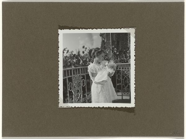 This is an undated photograph entitled 'Gezeten vrouw aan het bloemschikken' made by the Société Anonyme des Arts Graphiques. It presents a seated woman arranging flowers, set against a backdrop that appears to be a well-lit interior. The composition is carefully structured, utilizing the contrast between the soft textures of the flowers and the relatively sharper lines of the architectural setting. The photographer has paid attention to the play of light and shadow, which enhances the three-dimensionality of the scene. The choice to depict this subject aligns with a broader historical interest in capturing everyday life, yet the formal qualities elevate it beyond mere documentation. In its delicate balance of light, texture, and compositional harmony, the photograph functions as a semiotic structure, where the arrangement of visual elements creates a space for contemplation on themes of beauty, domesticity, and artistic representation.