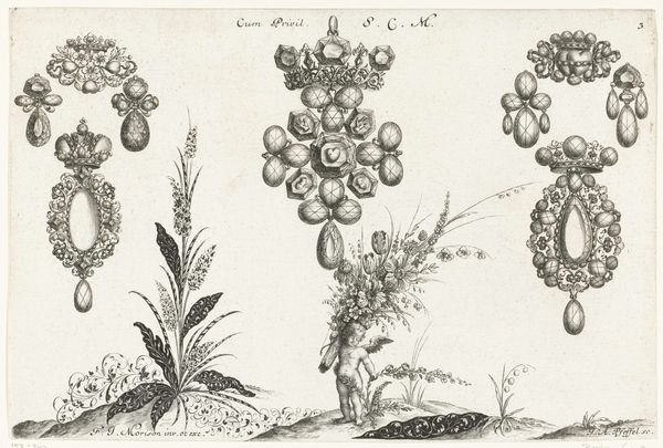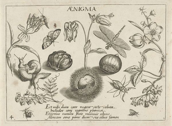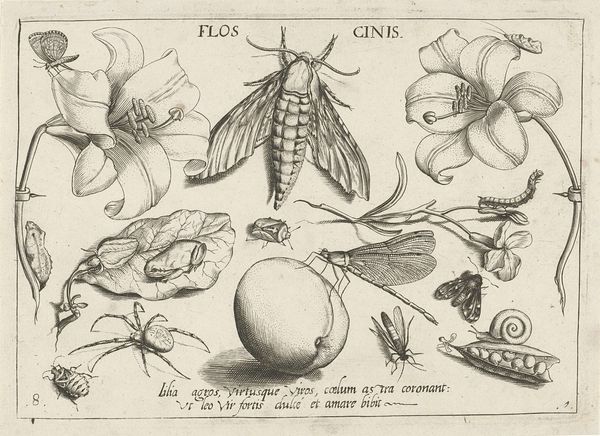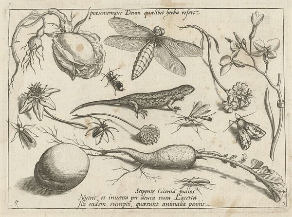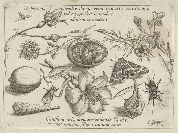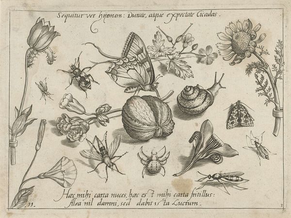 Curator: This image is an engraving titled "Dieren, planten en vruchten rond een slak," or "Animals, plants and fruits around a slug," and it's a fascinating piece dating somewhere between 1592 and 1726. It's attributed to Jacob Hoefnagel. Editor: A slug, eh? My first thought: a rather…mundane centerpiece. It gives the piece a curiously grounded, almost unsettling feel. The fruits look so meticulously rendered, practically bursting with flavour, while the slug sits there, unapologetically slug-like. The artist seems to have wanted us to compare and contrast the beauty with the more bizarre elements of the world. Curator: Absolutely. Hoefnagel’s engravings were, at times, about meticulously cataloging the natural world. It feels like the slug represents the earthly, creeping element amidst a cornucopia. What strikes me is the inclusion of the latin text - Ipsa dies aperit: conficit ipsa dies- which translates to: the day itself opens: the day itself completes. It suggests the ephemerality of existence - what do you make of the arrangement? Editor: Ah, that is an excellent point, it makes you feel very uneasy. And this engraving’s placement of these elements creates a peculiar microcosm: there are other little beasts here: caterpillars, spiders, flies, even. All of the elements seem to border each other carefully, yet all contribute to that fleeting beauty we take from it. The composition creates tension between detail and death! Curator: Precisely. Death is an interesting focal point when considering a naturalist. Given these things surrounding that massive, dominant, slug! These things tell a little narrative when taken together. Editor: In this image it feels inevitable, too, but a certain stillness has it lingering. These images remind us of the circle of life and death. The slug is more of a memento mori than an unattractive garden pest when you place it there at the centre of the picture. Curator: What is even more exciting to think of, in a work so focused on earthly nature, what about those beautiful blooming vines across the top - are they beautiful and alluring in that symbolic language? It definitely does a good job contrasting our focus points from that natural setting to a heavenly outlook - making use ponder not on just earthly concepts, but religious interpretations too. It’s so exciting to try and delve deeper into these possibilities! Editor: You’re right, so many possibilities. It's funny, I initially focused on the rather sluggish subject of this piece, but I'm leaving with a richer understanding of ephemerality, and its complex visual language around life, death and decay.