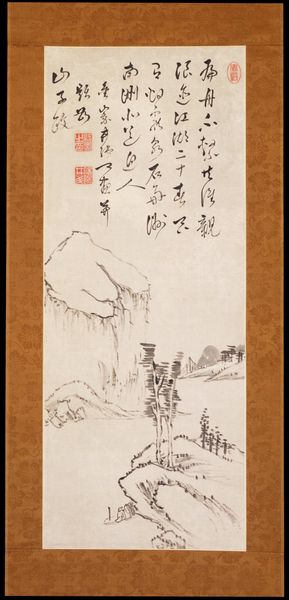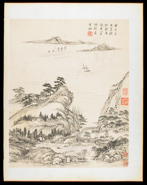 Wang Chen created this album leaf from *Landscapes from Nature* in the 18th century using ink on paper. Wang Chen lived during the Qing dynasty, a period of both prosperity and strict cultural control in China. Reflecting the literati ideals, Wang Chen integrates poetry, calligraphy, and painting, cultivating an image of the educated elite. The monochrome ink evokes a sense of simplicity. However, the composition guides the viewer's gaze from the travelers at the bottom to the scholars at the top, creating a hierarchy within the landscape that mirrors the social structures of the Qing Dynasty. The landscape presents an idealized vision of nature, promoting harmony and order. Consider how this vision, while aesthetically pleasing, might also function to reinforce prevailing social norms.