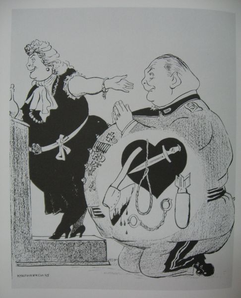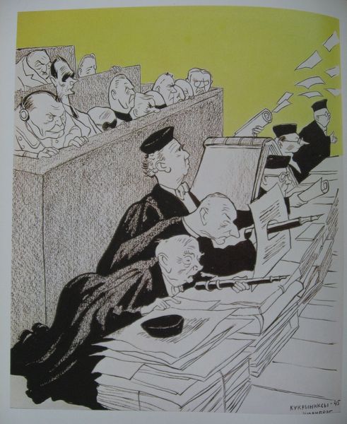 Kukryniksy, a group of three Soviet cartoonists active from the mid-1920s to the late 1980s, created this ink drawing, "Nuremberg". The composition employs stark contrasts, with thick, dark lines defining the figures against a bright, almost clinical white background. This limited palette emphasizes the graphic nature of the caricature. The figures of the accused are rendered with exaggerated features. Notice how the artist has used the formal elements of caricature – elongated noses and exaggerated cranial features – to convey an emotional response, a sense of unease or perhaps even mockery. This work gains meaning through semiotics, where visual elements function as signs. The headphones, for instance, symbolize the disengagement or detachment of the accused from the gravity of the proceedings. Their averted gazes and the back view of the central figure further isolate them, suggesting a deeper alienation or culpability. The contrast between the literal scene and its symbolic representation invites us to question the spectacle of justice and the psychological distance of those on trial. In conclusion, the power of "Nuremberg" lies not just in its aesthetic qualities, but in its ability to provoke reflection on the complexities of judgment and the enduring impact of historical events through a combination of formal elements.
