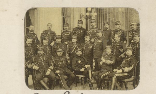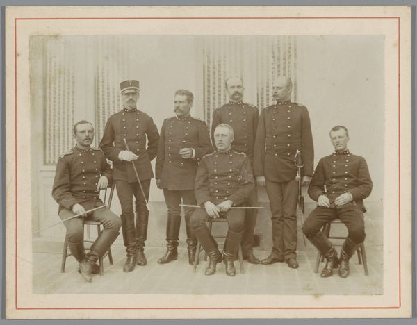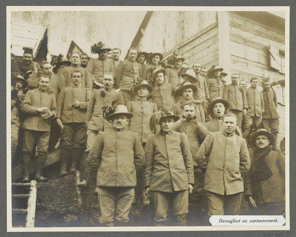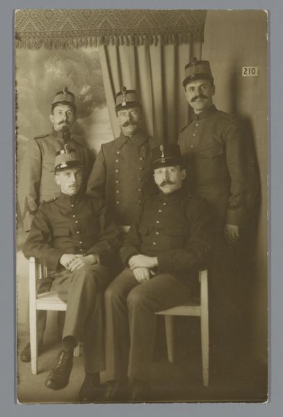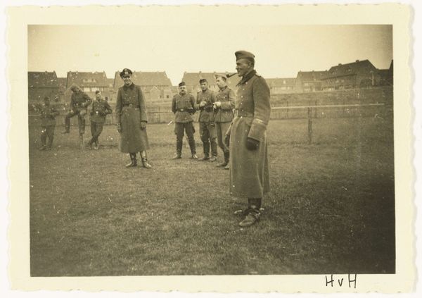 Curator: This photograph, simply titled "Groep Duitse militairen" or "Group of German Soldiers", comes to us from the period of 1940 to 1945. The photographer remains anonymous. Editor: What strikes me immediately is the ordinariness. These are young men, posing almost reluctantly. The light is flat, the landscape featureless, drained of hope perhaps? Curator: The production itself, a black and white print, speaks volumes about the period. Think of the rationing of materials during the war years. Photography wasn't just documentation; it was a product shaped by limitations and access. Editor: Exactly! And each element of the uniform--the helmet held so casually, the placement of their caps and the position of the belts--serves a very definite function. All carry with it a coded message of authority and military strength. What stories are embedded within these items, reflecting individual experiences within this historic collective? Curator: Beyond individual experience, the act of creating this group image, its dissemination—these factors are central to understanding it. How it may have circulated among families and how those images were reproduced, displayed, and archived shapes the narratives that linger. Editor: And what do these postures mean? Each helmet being held evokes ancient traditions of weaponry being held to present their prowess, whilst the uniform is an undeniable display of order, but at the same time individuality comes through: some have different facial expressions or styles. Curator: Considering its location in the Rijksmuseum, it's removed from its original context and transformed into a historical artifact. We are left to grapple with the layered meanings assigned to the soldiers, the photographer, and those implicated in the reproduction and its survival to the current time. Editor: Indeed. This isn't merely a photo; it’s a loaded cultural artifact with a lasting echo, shaped and still being reshaped with meaning.