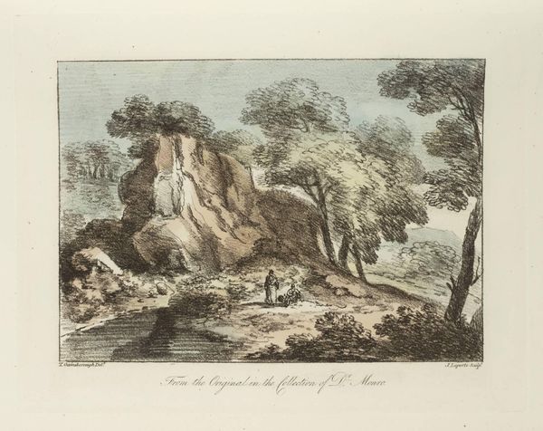 Editor: This print, by Thomas Gainsborough, shows a pastoral scene. The textures created by the etching are quite striking, especially in the trees and water. What do you see in its composition? Curator: Note how Gainsborough orchestrates the composition through carefully arranged forms. The diagonal thrust of the landscape is stabilized by the horizontal plane of the water, while the dark, dense masses of trees are counterpointed by the lighter areas of the sky. These formal relationships are what structure the viewing experience. Editor: So, it's about how the lines and shapes interact rather than what they represent? Curator: Precisely. Consider the strategic placement of the figures; they serve less as narrative elements and more as compositional anchors, balancing the visual weight of the trees on the right. Editor: I hadn’t considered that! Seeing the figures as shapes makes a difference. Curator: The interplay of light and shadow also creates a sense of depth and volume. This close attention to formal elements reveals a sophisticated understanding of visual language. Editor: Fascinating; I'll definitely look at landscapes differently now.