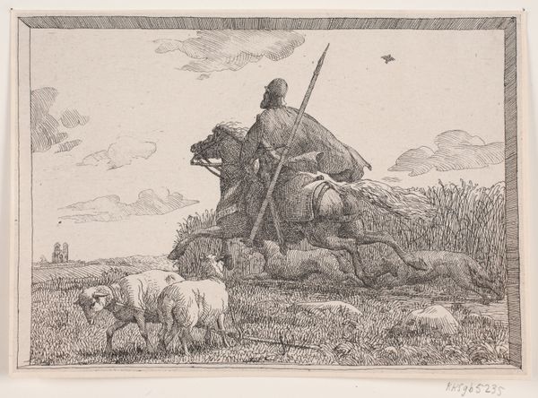 Editor: This drawing, "Landschap met drie koeien" or "Landscape with Three Cows" by Leendert de Koningh, was created in 1826. It's a pencil drawing and immediately, the soft, almost hazy light, gives it a very peaceful quality. The composition feels very carefully balanced, with the cows taking up a significant portion of the foreground. What stands out to you when you look at this piece? Curator: Formally, the drawing demonstrates a masterful manipulation of line and tone. Notice how the artist uses hatching and cross-hatching to create a sense of depth and volume, particularly in the rendering of the cows. The variations in pressure create an impressive luminosity for pencil on paper, don’t you think? Editor: Yes, the shading is incredibly subtle! It almost makes them look like they're glowing softly. I hadn't really considered that until now. Curator: Precisely. Now consider the placement of the objects within the frame. How would you describe the artist’s organisation of this piece, thinking of the landscape and animals as elements in tension with each other? Editor: The foreground feels very detailed, with the focus on the cows. Then, the background has the suggestion of a church and grazing cattle. It seems less defined which is likely creating some depth... Curator: The foreground and background work together, precisely. We see the relationship between sharp lines in the detailed close ground contrasted against the muted light that comes with distance. Ultimately the eye is drawn back into the plane through the interplay of light and the suggestion of the cows blending with their pastoral setting. Editor: I'm definitely seeing so much more nuance in the line work and how that creates depth, rather than just seeing "cows". Thanks so much. Curator: And I appreciate your ability to look beyond the subject matter and engage with its underlying formal arrangements!