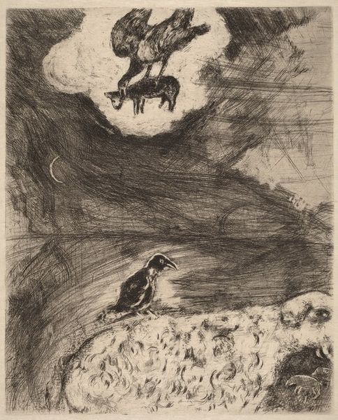 Marc Chagall made this etching of a heron sometime in the 20th century, and you can see how he embraced the beauty of simple marks. The whole image feels like it's built from a network of tiny scratches. Up close, you notice how the texture isn’t just about depicting something; it’s alive in itself. Look at the way he renders the water, a flurry of nervous lines that gives a sense of shimmering movement. Then check out the heron itself, solid and still, its dark feathers created with dense, overlapping marks, so different from the fluidity surrounding it. This contrast creates a visual tension, and the eye bounces between the stillness of the bird and the restless energy of the water. Chagall’s work always reminds me of Miró, that same playful exploration of line and form, a world where things aren't quite as they seem and imagination rules the day. Art isn’t about fixed meanings, it's about possibilities.