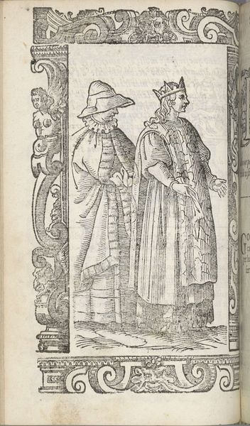 Christoph Krieger's "Spose nobile di Norvegia" presents us with an intriguing study in contrasts, rendered through the graphic precision of ink on paper. The composition, dominated by two figures adorned in elaborate garments, strikes a balance between symmetry and subtle variation. Observe the texture achieved through fine, cross-hatched lines, creating a sense of depth and volume, particularly in the fabric folds. This attention to detail invites us to consider the structural elements underpinning the artwork's meaning. The use of pattern, especially in the dresses, can be interpreted as a semiotic system, where each motif acts as a signifier of status, origin, or identity. The ornamental border framing the image is not merely decorative. It serves to isolate the figures, elevating them to a symbolic realm. This interplay between representation and abstraction challenges our perception of reality, prompting a re-evaluation of cultural codes and artistic conventions. The artwork, therefore, transcends its immediate subject matter, functioning as a critical engagement with the very structures of representation and meaning-making.