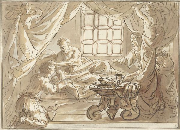 Editor: Here we have a drawing by Jean-Honoré Fragonard titled "Vor einer antiken Statue lassen Kinder einen Esel von einem Altar fressen," or “Children letting a donkey eat from an altar in front of an antique statue.” It appears to be done in ink, and it has such a playful, mischievous energy. What strikes you most about this work? Curator: The scene's apparent lightheartedness, the Rococo playfulness, is exactly what begs interrogation. Why stage this irreverent scene, children seemingly unconcerned about the defilement of sacred space, with the clear classical allusions from the statue? Editor: So, it’s not as straightforward as it seems? Curator: Precisely. Fragonard situates this moment within a visual dialogue between childhood innocence and classical authority, undermining that authority. Consider how Enlightenment ideals were reshaping societal norms. Could this playful desecration be a commentary on the perceived stagnation or irrelevance of established institutions? The casualness with which the children engage with the statue, the focal point of Western civilization, asks: Who holds the power and whose narratives are being prioritized? Editor: That’s fascinating. The choice to depict children almost mocking a statue suggests a challenge to the traditional values. It’s a bold statement! Curator: Yes, Fragonard encourages us to question how we perceive power structures and consider whose voices and perspectives have been historically marginalized. And even consider if this scene suggests the importance of free play as a vehicle for dismantling norms and questioning conventional wisdom. Editor: I’ll definitely look at Fragonard differently now. I appreciate the insight into how societal contexts shaped his art. Curator: Art becomes a dialogue. Looking closely at a piece within its time lets us understand both where we've been and what work still needs doing.