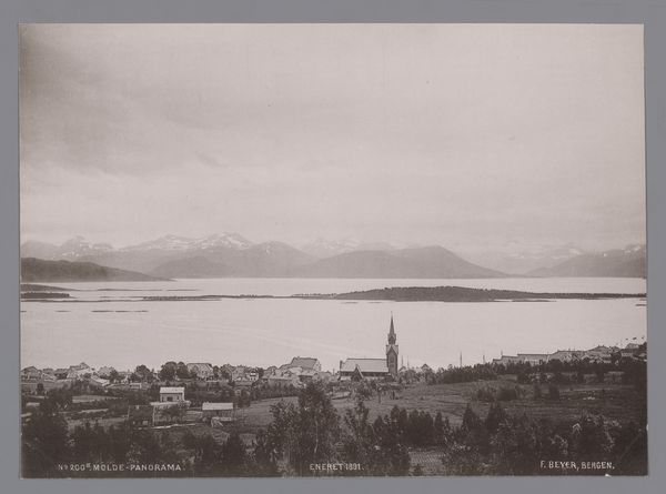 Curator: Here we have "Luzern met berg Pilatus, Zwitserland," a photograph created before 1899 by Photoglob & Co. This piece resides within the Rijksmuseum collection and presents a cityscape bathed in a soft, pictorialist light. Editor: My immediate feeling is one of serene stillness. The composition, the almost dreamlike monochrome palette, it evokes a palpable sense of romantic detachment. Curator: Indeed. The use of photography to create that emotion is interesting because we tend to view the medium as objective, when of course, framing and lighting were as deliberately crafted then as they are today to affect emotional impact. Early photography frequently engaged with social debates around industrialization. One wonders if the composition in Luzern is suggesting refuge or looking at an imposition. Editor: I am fascinated by how mountainscapes so frequently act as symbols of both the sublime and the untamed. Here, Pilatus looms, majestic yet somehow passive, overseeing the cityscape nestled below. It evokes that common cultural yearning to be small and safe in the face of such grandeur. Curator: Absolutely, it's difficult to divorce landscape from power and perspective, isn't it? Consider that mountain’s visibility. Whose gaze does it invite, and whose does it block? We must be conscious that photography during this period became entwined with the power dynamics of exploration, empire, and class privilege. It both documented and shaped a worldview predicated on observation and categorization. Editor: Yes, the gaze! And thinking of "gaze", the image reminds of the sublime power represented in Caspar David Friedrich's work in painting, particularly those paintings dealing with solitary figures within a vast landscape, figures rendered deliberately tiny to reinforce the sheer overwhelming force of nature. One almost longs for a tiny, contemplative figure here. Curator: While Friedrich offers individual introspection, the lack of such a figure is also impactful when looking at it from a class perspective: this is meant to represent civilization as a whole existing, hopefully coexisting, in this grand landscape. The early city as idea. Editor: Perhaps. The power lies in the collective potential rather than the individual journey of Friedrich's wanderers. Looking closely, though, that duality feels very potent in this specific image. I leave here reflecting on landscape, representation, and that age-old pull towards the dramatic serenity of mountains. Curator: And I'm pondering what a view says, whose purposes does it serve and whom is omitted in its creation. Always something to discuss when examining history.