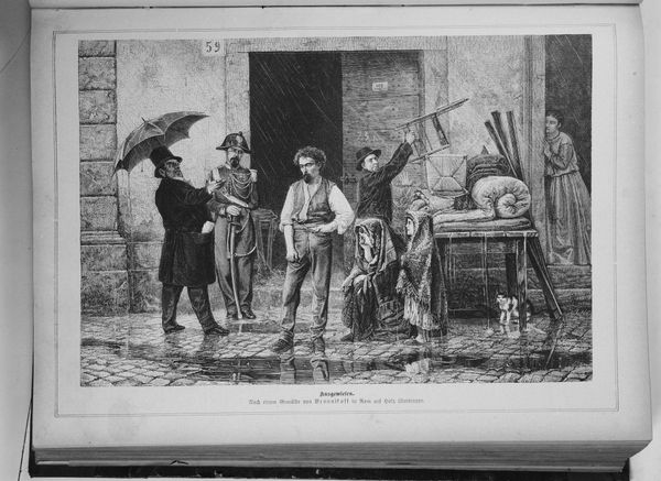 Curator: This captivating monochrome street scene is entitled "A Plaster Cast Vendor. Copenhagen Street Scene," brought to life in 1838 by Julius Friedländer. Editor: It’s remarkable. The stark light and shadow give it a decidedly theatrical feel. Like a stage set, frozen mid-performance. The vendor looks very convincing, you almost believe you are there buying a statue. Curator: The composition guides our gaze expertly. The artist uses the archway to frame the figures and create depth, leading the eye toward the distant tower. Note also the geometry of the lamp on the left contrasted with the soft curve of the archway; consider what symbolic meaning is conveyed. Editor: I’m struck by the socio-economic narrative embedded here. We have this tableau of what looks to be bourgeoisie inspecting classical statues offered by this young vendor. What is the accessibility of art and culture to Copenhagen's emerging middle class at this moment? Are the casts a stand-in for the grand tour’s treasures for those who don't have access? Curator: The distribution of light is another subtle touch that deserves further analysis. How does the light in the tunnel affect our interpretation and how it reflects with the rest of the imagery? Editor: Exactly. Consider also, the gaze of the people depicted; they make the impression of deep thinking; Friedländer could have named this piece 'Contemplation'. There is so much visual information. Curator: And the meticulous detail applied to each figure! From the vendor's wares to the clothing of the bystanders. Editor: It is a very beautiful example of Copenhagen. I am also stuck on the perspective and how it is achieved! Curator: Absolutely, the layers and subtle gradations in tone truly transport you. The eye lingers and keeps finding something new. Editor: Indeed. I’ll certainly be pondering this depiction of 19th century Copenhagen and its societal implications for some time.