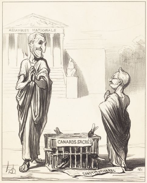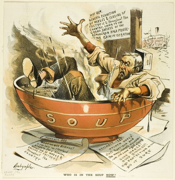 This color lithograph was created by C. Jay Taylor for Puck, a satirical magazine printed in the late 19th century. Lithography is a printmaking process that involves drawing on a flat stone or metal plate with a greasy substance, then applying ink to transfer the image onto paper. The resulting prints, like this one, can be produced in large quantities, making them ideal for mass media. The image here depicts the impact of the McKinley Tariff Act, with laborers being squeezed by industrialists, as a bucket marked "FAT" fills with money, while a senator turns away, seemingly unconcerned. What's interesting is how Taylor uses the lithographic medium to expose the social and political issues of the time, turning mass production against itself, and offering sharp commentary on class, labor, and the distribution of wealth in an industrializing society.