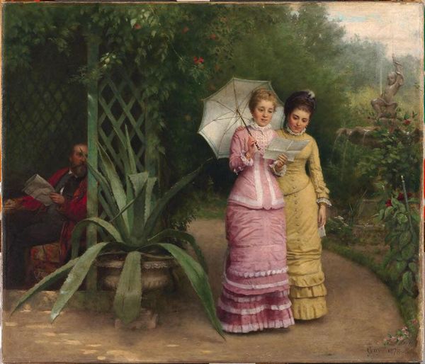 Eugen von Blaas painted 'The Flirtation' during the late 19th century, a period defined by strict social codes around gender and courtship. The painting depicts two young women in what appears to be a moment of playful interaction, while a man lurks in the background. The women’s elaborate traditional costumes, while visually appealing, also locate them within a specific class and cultural context. The flirtation could be read as both an innocent encounter, and also a calculated performance. The work raises questions about the dynamics of observation and the gaze. In painting women as objects of beauty and interest, von Blaas walks a fine line between representation and objectification. How do these women negotiate their own identities within the constraints of their time? The furtive glance of the man in the background only complicates the image's implications. Ultimately, 'The Flirtation' invites us to consider the multifaceted roles women played in society and the subtle ways they asserted their agency within these confines.