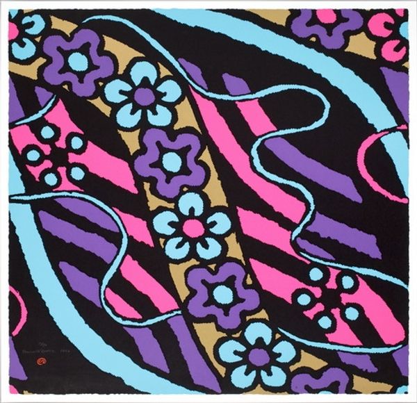 Curator: Valerie Jaudon's painting, "It Happened Tomorrow," completed in 2004, offers a fascinating example of contemporary abstraction through a mesmerizing composition. What's your initial take? Editor: Immediately, the interwoven lines evoke a sense of intricate dance. The geometric elements almost feel like characters in a stylized ritual, something ancient and modern colliding. Curator: I find it interesting to consider how Jaudon engages with the legacy of pattern and decoration movements, while still very much operating within a contemporary art market shaped by different critical concerns. It subtly challenges the traditional hierarchy. Editor: Absolutely, the rhythmic repetition hints at textiles, perhaps tapestries from the past, yet the abstraction steers it clear of simple reproduction. There's a memory of craft but transformed into a personal visual language. That pale blue is also so striking. Curator: That particular blue lends itself to endless reproduction. It softens the potential harshness of pure geometry, making the work palatable to diverse audiences. Editor: Yet, if you focus, many elements of the lines curve back on each other, reflecting self-containment that hints at themes such as fate and circularity. The repeated arrowheads speak to movement but in very restrained pattern. The use of color to accentuate direction and guide one's eyes. Curator: And considering that Jaudon came into prominence during the 1970s, there is definitely the influence of feminism into design vocabulary where craft was looked at and re-evaluated, and even painting at large! Editor: Ultimately, for me, it is about memory—how forms resurface, repurposed, becoming whispers of something deeply rooted in our shared visual past. It invites us to consider the enduring power of basic shapes and pattern. Curator: I agree, her work demonstrates how these simple structures allow for an expression within an industry and environment of political movements and economic concerns. Jaudon, in particular, navigates this moment with striking effect.
