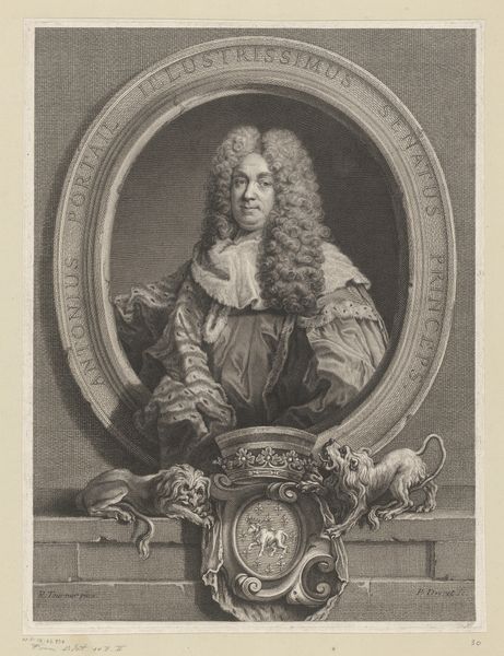 Curator: Today, we’re looking at "Portret van Hieronymus von Erlach", an engraving executed by Johann Georg Wille between 1748 and 1808, held here at the Rijksmuseum. Editor: Whoa, so much texture. That wig alone could house a whole colony of small, erudite birds! But seriously, it’s a compelling image—austere yet ornamented. Almost performative, wouldn’t you say? Curator: Quite. The artist meticulously renders varied surfaces—the sheen of metal in the weaponry displayed beside Erlach, the textured drape of fabric, even the velvety appearance of his formal attire. The density of information serves to convey power and prestige. Editor: It’s almost comical how determined it seems to pack every symbol of authority into one frame. Is he about to wage war, write a treatise, or conduct an orchestra? He looks ready to do everything! The spear feels a bit much though. Curator: The items surrounding Erlach, the helmet, papers, and that spear you mentioned, are more than mere decoration; they're emblematic attributes meant to signal his social standing, achievements, and interests—cornerstones of the Baroque portraiture tradition. It situates him firmly within a narrative of status. Editor: Absolutely. I get that. But does the sheer density distract from Erlach himself? I find my eye flitting all over the place. Do you think it achieves a sense of depth and space, or does it flatten him? I see both. Curator: Well, the visual impact arises in part from the precise, unwavering line work typical of engraving, yielding stark contrast. However, this graphic precision allows Wille to meticulously define a complex interplay of shapes and forms, inviting active participation of the viewer in resolving visual tensions in its pictorial space. Editor: The light is masterfully used to lead us across the symbols and to land directly on Erlach. Like the man knew what lighting was a good century before Hollywood directors did. Curator: In the final analysis, the engraving isn’t simply about representation, it serves as an idealization—an effort to craft an enduring image aligned with principles of hierarchy, power, and virtue that the engraver was seeking to instill and preserve. Editor: In conclusion, it's a piece about image management and crafting that perfect public persona, but executed with incredible, obsessive detail that I can’t help but love.