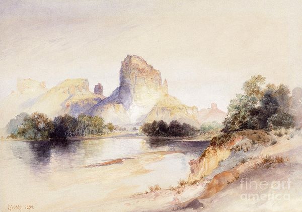 Editor: Here we have Thomas Hill’s oil painting, “Crescent Lake.” While the date is not available, its luminosity and subject matter strongly suggest it was created en plein air, during the late afternoon, maybe even capturing the magic hour. What’s particularly interesting is the thickness of the paint used to render that imposing rock formation. What are your initial thoughts on this work? Curator: For me, what stands out is the tension between the supposed "naturalness" of the scene and the very deliberate act of its construction. Think about the labor involved: mining the pigments, processing the oil, weaving the canvas, and the physical act of applying the paint. It challenges this romantic notion of a pure, untouched landscape. Editor: I hadn’t considered that angle. The Hudson River School is often seen as simply celebrating nature. Curator: Exactly! But by focusing on the materials and their origins, we reveal the economic and social underpinnings of this artistic movement. Where were the raw materials sourced? Who processed them? And for whom was this idealized vision of nature ultimately intended? Was this vision accessible or desirable for everyone in that time and place? Editor: So, it's less about the "wow" factor of the view and more about the industrial processes behind the painting? Curator: Not exclusively, but the materiality forces us to confront the constructed nature of even the most seemingly idyllic landscapes. It begs us to remember that paintings like "Crescent Lake" were commodities produced within a specific economic and social system, using specific materials sourced and processed through specific means of production. Even "naturalism" has a production process, a cost. What are your thoughts now? Editor: I appreciate that perspective. I will never look at landscape painting the same way. Curator: And hopefully, we won't just look but critically examine the material world that shapes our view of art, of landscape, and of the resources around us.