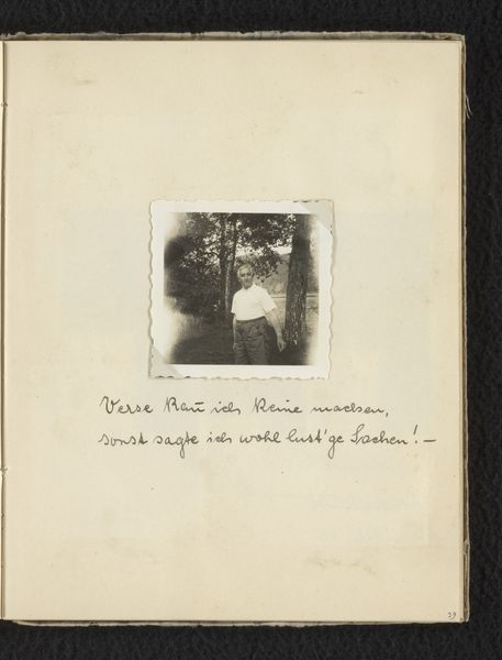 Editor: So, here we have a photograph from 1920-1922, titled "Eugen Wachenheimer in de openlucht tijdens zijn verlovingstijd, 1920-1922, Duitsland," as part of the Familie Wachenheimer collection. It's like a snapshot nestled within what looks like a personal journal. The black and white image has such a wistful air. What strikes you when you look at this piece? Curator: The immediate symbolism is of a time capsule, isn't it? This isn't just a portrait; it's a fragment of memory deliberately preserved. The handwritten script surrounding the photograph – do we know what it says? The placement, the visible binding…it suggests a conscious act of memorializing a specific moment in time, his engagement period. It prompts questions about the nature of memory, both individual and collective. What does the open-air setting signify to you, compared to a studio portrait? Editor: The outdoor setting feels more… authentic? Less posed, more intimate somehow. Do you think that intimacy was the intention? Curator: Perhaps. Or perhaps the ‘open air’ acts as a symbolic contrast to the societal constraints brewing in Germany at that time. Notice how the text appears almost like runes framing the central figure. What meanings could these words layered above the image have? Is the choice of this particular script – the "thick font" as the tags indicate – intentionally invoking a sense of history, or is it simply the everyday handwriting of the author? Editor: It does feel like a kind of… encoding, adding layers to the story. The fragility of the paper, the fading of the photograph, it all amplifies that sense of a precious memory being carefully guarded. Curator: Precisely. The whole assemblage functions as a powerful symbol of love and loss against the backdrop of looming historical upheaval. This photograph is a coded message about memory’s persistence against time and turmoil. Editor: I hadn't considered it in that light. It definitely gives the portrait a new weight, knowing it exists within that historical context.