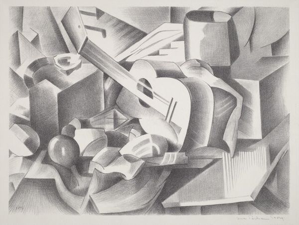 Juan Gris created this drawing, "Still Life with Coffee Mill", in 1916. The monochromatic pencil drawing on paper constructs everyday objects through a Cubist lens. Look closely at how forms intersect and overlap, creating spatial ambiguity. Gris employs a muted palette, focusing on tonal variations to define shapes. Notice how he breaks down the objects into geometric components, reassembling them in a way that challenges traditional perspective. This fracturing of form reveals multiple viewpoints simultaneously, inviting us to consider the object from various angles at once. The drawing's composition is structured yet dynamic, mirroring broader artistic and philosophical inquiries into perception and representation. Through the semiotic system of Cubism, Gris destabilizes fixed meanings, prompting ongoing interpretation.