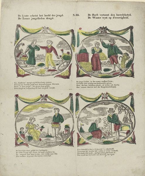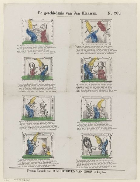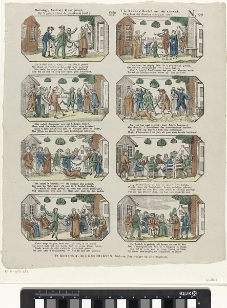 This print, by Glenisson & Zonen, depicts scenes from 'Kloris and Roosje', a popular Dutch comic play, using a combination of image and text. Prints like this one played a vital role in popular culture. In a time before widespread literacy, the sequence of images allowed people to follow the narrative, sharing stories and solidifying a sense of national identity. This particular print, like the play itself, would have been intended for family audiences and is full of references to Dutch social life. Notice, for example, the depiction of traditional clothing and the interiors of domestic spaces. These images serve as a historical record. They offer valuable insights into the values, customs, and entertainment of the time. To truly understand the print, we might delve into Dutch theater history, popular literature, and the social history of the Netherlands. This would allow us to see this artwork not just as a pretty picture, but as a window into a specific moment in time.
