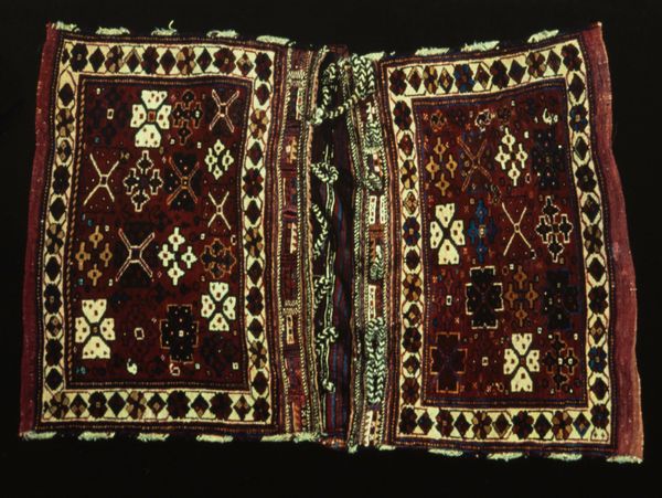 Curator: We're looking at an intriguing "Saddle bag," a textile work dating to around the 19th century and currently held in the Minneapolis Institute of Art. Editor: Immediately striking. The intricate diamond pattern creates such a visually rich and texturally compelling surface, especially considering its original utilitarian function. Curator: Exactly. And the term "utilitarian" is key here. While on its surface it is a "Saddle bag" woven from wool, a seemingly functional item, the abstract geometric motifs speak to larger questions of trade and cultural exchange that took place between Indigenous communities across the Americas. Editor: I see that. And these repeating geometric forms--what appear to be variations on a diamond--give a sense of structured play, of the kind of complex formalism we associate with textiles. It creates depth and almost an optical effect through the shifts in color and value. Curator: I would emphasize that this weaving is far from optical illusion. The craft practices and designs were deeply interwoven with indigenous social and economic systems, a symbol that encapsulates much broader negotiations that these populations navigated on a daily basis. Editor: Certainly. These kinds of patternings may carry a social history of identity but it seems too, we might also consider the visual vocabulary employed--the relationship between color, ground, and pattern as part of that expressive tradition. Curator: Right, and considering its placement on a saddle, it was on full public display as a marker of status, kinship, and alliance for its owners. Editor: The tension between abstraction and cultural signal certainly deepens the impact. A successful commingling between material, form, and message. Curator: Indeed. When we start thinking about it not just as an aesthetic object but a vital part of a network of social and material relationships, it enriches our appreciation of its purpose. Editor: A reminder that aesthetic contemplation should lead back into considering cultural context. Curator: Yes, I think in considering it as a cultural artefact, we give depth to those considerations of colour and space you spoke about, which enables further conversation and inquiry.