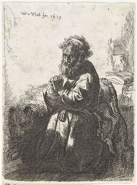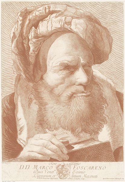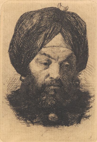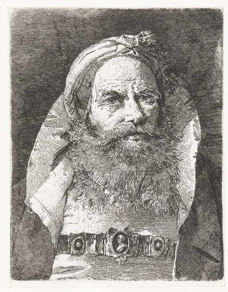 Curator: Before us we have Giovanni Domenico Tiepolo's etching, "Old Man with a Turban," dating from 1757 to 1774. The use of line is just spectacular! Editor: Stark. Striking! The density of the hatching gives it a certain... gravitas. It evokes a certain world-weariness, wouldn't you say? Curator: Absolutely. Note how the intricate lines delineate not only form but also texture. The turban itself becomes a focal point, its folds echoing the lines of the man's aged face. Consider how it subtly highlights the play of light and shadow, thereby constructing a sense of depth. Editor: Right, but that turban! It's less an authentic garment and more a costume, almost theatrical. It reminds me of the period’s orientalist fantasies and how European artists would exoticize their subjects—whether intentionally or not. What kind of social context do you suppose led to such imagery? Curator: It's an interesting question, though my concern remains mostly in the manipulation of the medium. Look how Tiepolo creates form and mass through such incredibly controlled bites and scratches. In particular, observe how he coaxes out this palpable likeness, primarily via the controlled density of his marks and lines. Editor: Fair enough, but technique and effect cannot be divorced from their time, surely! In many ways, the piece presents us not only with a portrait, but also with questions about the West's construction of the "Other" during the height of empire. Curator: It's an image mired in the details of light and shade. Look past the apparent subject matter to behold this virtuoso demonstration in the sheer technicality of expression and you will grasp the appeal and beauty. Editor: Yes, and, perhaps more so if one allows for the implications of its politics to linger, making one reconsider even these technical components in new lights. Curator: Indeed, the layers of complexity that great artworks afford and open to audiences through various interpretative lens’. Editor: An interplay of gazes, no less; it challenges us to reassess not only the image before us, but the world, then and now.