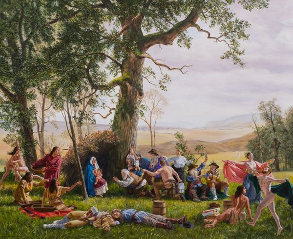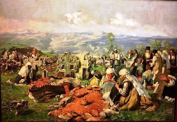 Curator: Let's spend some time with Ivan Mrkvička's "Zadushnitsa" from 1890. It’s an oil painting capturing a very specific cultural tradition. Editor: My first impression is how poignant it is. There's a somber yet somehow communal atmosphere radiating from the canvas. The scale feels significant too, almost like a staged tableau vivant. Curator: Indeed. The title, "Zadushnitsa," refers to a day of remembrance for the dead in Eastern Orthodox traditions. Mrkvička painted this scene depicting precisely that, highlighting both the public performance of grief and private moments of mourning within the community. You can really see that duality present. Editor: Absolutely. Looking at the materials—the oil paint itself—the artist masterfully uses it to differentiate textures: the rough-hewn stone of the crosses, the softer fabrics of the mourners’ clothes, and even the varied surfaces of the offerings they've brought. All are rendered with attention. It raises questions about labor too—who produced these materials, both the art supplies and the grave goods? Curator: And how such customs are perpetuated. It is also fascinating to consider Mrkvička's own position within this social landscape. A Czech painter portraying a South Slavic custom, navigating his own identity within the Austro-Hungarian Empire…it speaks volumes about the flow of cultural exchange and the gaze inherent in representation. The artistic academy very much expected this type of work. Editor: It is all there, in plain sight, or not so plain. Consider those crosses. The carvings have a very tangible quality. And what is offered? Small goods, small gestures accumulated, massed for one to remember a loss, the process itself the means and not the painting. It’s fascinating how the artistic traditions of Realism merge with deeply rooted social practices to commemorate and perhaps subtly critique. Curator: Mrkvička gives us access to reflect on how communities process mortality collectively, on public expressions of grief, and of course what informs that. It brings us face to face with ourselves in many ways. Editor: Exactly. Thinking about this painting in terms of production and consumption changes how one views the scene presented before us. It makes one stop to think about every component's purpose and material worth as one moves through this work of art.