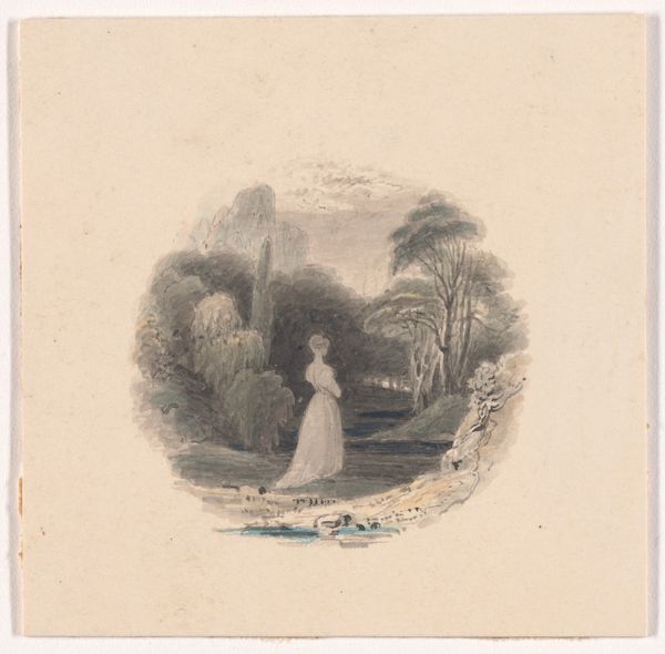 Curator: This is Frank Howard's "Illustration design for 'The Economy of Human Life'," dating to 1834. It is currently held at the Metropolitan Museum of Art. What's your initial impression? Editor: It feels... delicately melancholic. The watercolor and colored pencil lend themselves to a wispy, dreamlike quality. And such fine detail! What immediately draws me in is the almost palpable stillness of the scene, contrasted with the rippling water, and the very careful rendering of fabric, almost sculptural. Curator: That's astute. The landscape plays a crucial role, almost acting as a character itself, a popular trope for artwork of the romanticism art style. Howard utilizes line and color to construct spatial depth, and note how the positioning of the figure near the base of the trees anchors her both physically and symbolically. Her isolation seems deliberately emphasized. Editor: I'm thinking more about the materiality. We're looking at an illustration intended for reproduction in a book. It’s so refined. Imagine the labor and skill involved in both its creation, its initial distribution to only those who owned a copy of the illustrated book, and eventual mass reproduction. Were these designs carefully translated by engravers, for example? Curator: Indeed, the translation from original drawing to printed image is a fascinating point to consider. This colored-pencil and watercolor work bears evidence of both intention and skill, with the lines and forms composed just so, guiding the eye. Howard makes strong compositional choices, that much is evident. The eye traces her face, travels down the lines of her body, is then directed along the dog's leash to finally consider the rippling stream water. Editor: The print element introduces possibilities for mass culture and accessibility, altering both art's financial dynamic and, perhaps, even influence on contemporary society, regardless of medium. Did this illustration see wide circulation? And how might its themes and moral narrative shaped Victorian-era perspectives, outside those found within the "high" art world? Curator: Good questions, ones deserving further inquiry. Looking back, it’s remarkable to see how Howard merges formal aesthetic qualities with elements of a narrative theme, don't you think? Editor: I agree, and to me the narrative seems amplified and enriched by those often unseen aspects of production, circulation and context that shaped our experiences and still ripple out from the image to this very day.
