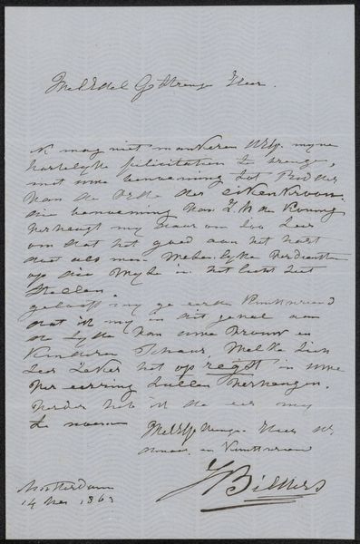 Curator: This is "Brief aan Ary Johannes Lamme," a letter possibly from 1866, penned by David Bles. It currently resides at the Rijksmuseum. Editor: My initial thought is that this feels deeply personal. The sloped, cursive script speaks of urgency and a close relationship, not just a formal declaration. It's almost intimidating, the thought of intruding upon such an intimate exchange. Curator: The letter itself is an intriguing artifact. Bles utilizes pen and ink on paper. This piece presents both an informative note and a sample of beautiful calligraphy. The material fragility hints at the preciousness of written communication in that era, and this is the primary way of reaching another person across even shorter distances. Editor: Exactly. And notice the rhythm in the script; the variable line weights must’ve been difficult to achieve. Each stroke had to be intentional, demanding careful hand-eye coordination. This process creates a sense of human presence that the speed of machine printing today really diminishes. Curator: Indeed, the calligraphic flourishes are evocative, creating almost a dance on the page. And note how the date at the top lends the piece an iconic feeling, like setting the stage for a dramatic event to come. It encapsulates the moment's importance. Editor: Speaking of the physical, what about the paper itself? I’d love to know more about its production. Was it mass-produced or handcrafted? The type of fibers and the paper’s surface would further inform the circumstances in which it was produced, received, and carefully archived until it got here. The story of a paper trail, leading us here and now, fascinates me the most. Curator: A good point. In its way, the paper bears silent witness to that historical exchange. It almost makes one consider the nature of fleeting conversations, whether a voice, a shared laugh, or simply the everyday chatter now entirely lost, or how the letter preserved this singular event to extend through history for our reflection today. Editor: I agree, this has certainly altered my impression— from a brief look into a possible important correspondence of art matters in the day, to consideration of process, social context, the materiality itself that conveys messages of production and archival for generations. Curator: Considering the interplay of image and language, its symbols, it is an honor to spend a short time appreciating how its artistic form captures human interaction so exquisitely.