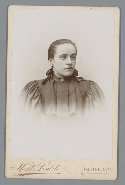 Editor: This is "Portrait of Anna Gesiena Jonker," made sometime between 1880 and 1920, attributed to Johannes Leonardus van der Heijden. It's a sepia-toned photographic print, and I’m struck by the sitter's modest presentation. What's your read on this work? Curator: Seeing this, I’m drawn to consider photography's role in democratizing portraiture. Before this, portraiture was largely the domain of the wealthy who could afford to commission paintings. The emergence of photography, particularly in formats like carte-de-visite prints, allowed a wider segment of society to participate in visual representation. Do you notice how the subject is styled? Editor: Yes, her clothes, though proper, look… well, manufactured? Like ready-to-wear items. Not bespoke or fancy. It reinforces the idea of broader access to representation. Curator: Precisely. Consider the economic impact of this shift. Textile factories mass-producing clothing, photography studios popping up in urban centers – it's a whole new economy based on image production and distribution. And think about the labor involved in printing these photographs, often under harsh conditions using toxic chemicals. The aesthetic is one layer, the production of that aesthetic another. Editor: That is fascinating, I had not thought about how those new systems of labor democratized art. Is there any evidence, beyond this portrait, that the studio targeted the emerging middle class? Curator: Well, the carte-de-visite format itself, designed for mass production and exchange, points to a market beyond the elite. Plus, looking closer at the photographer's stamp – the location in Amsterdam. We could research how much this portrait would cost relative to an average worker’s wage during that period. These small details embedded within the materiality of the artwork can speak volumes. Editor: I hadn't considered the production aspect so directly. This definitely expands my perspective on these portraits beyond just being about who's depicted. Curator: Indeed. Shifting the focus to production helps uncover the complex interplay of economy, technology, and representation in art.